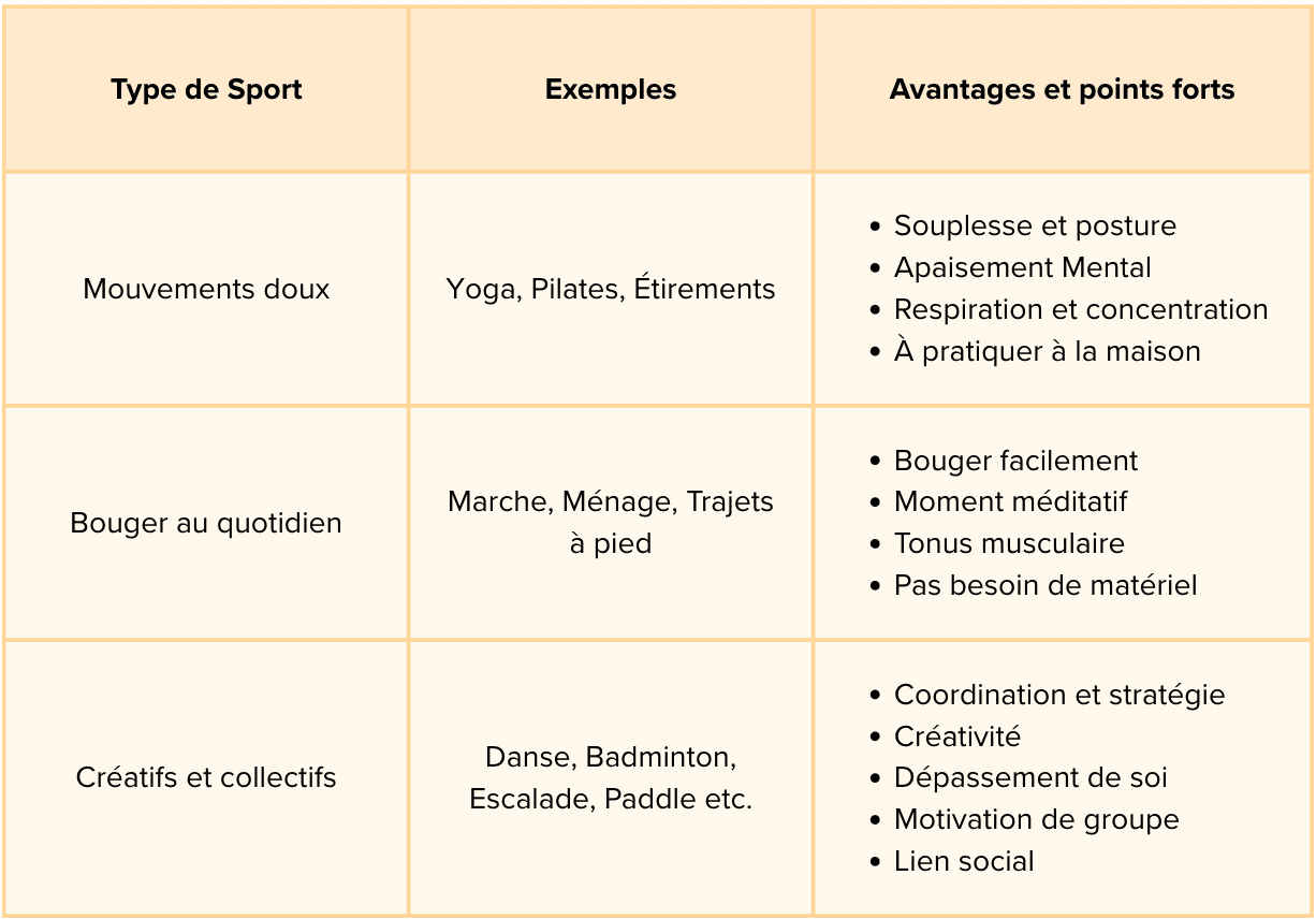 Bouger, ce n’est pas seulement entretenir son corps, c’est aussi prendre soin de son mental, de son énergie, de sa joie de vivre. Alors peu importe que tu transpires sur un tapis de yoga, dans une salle de danse ou entre deux stations de métro : l’important, c’est que tu y trouves du plaisir. L’essentiel est de choisir l’activité qui te donne envie de recommencer le lendemain.